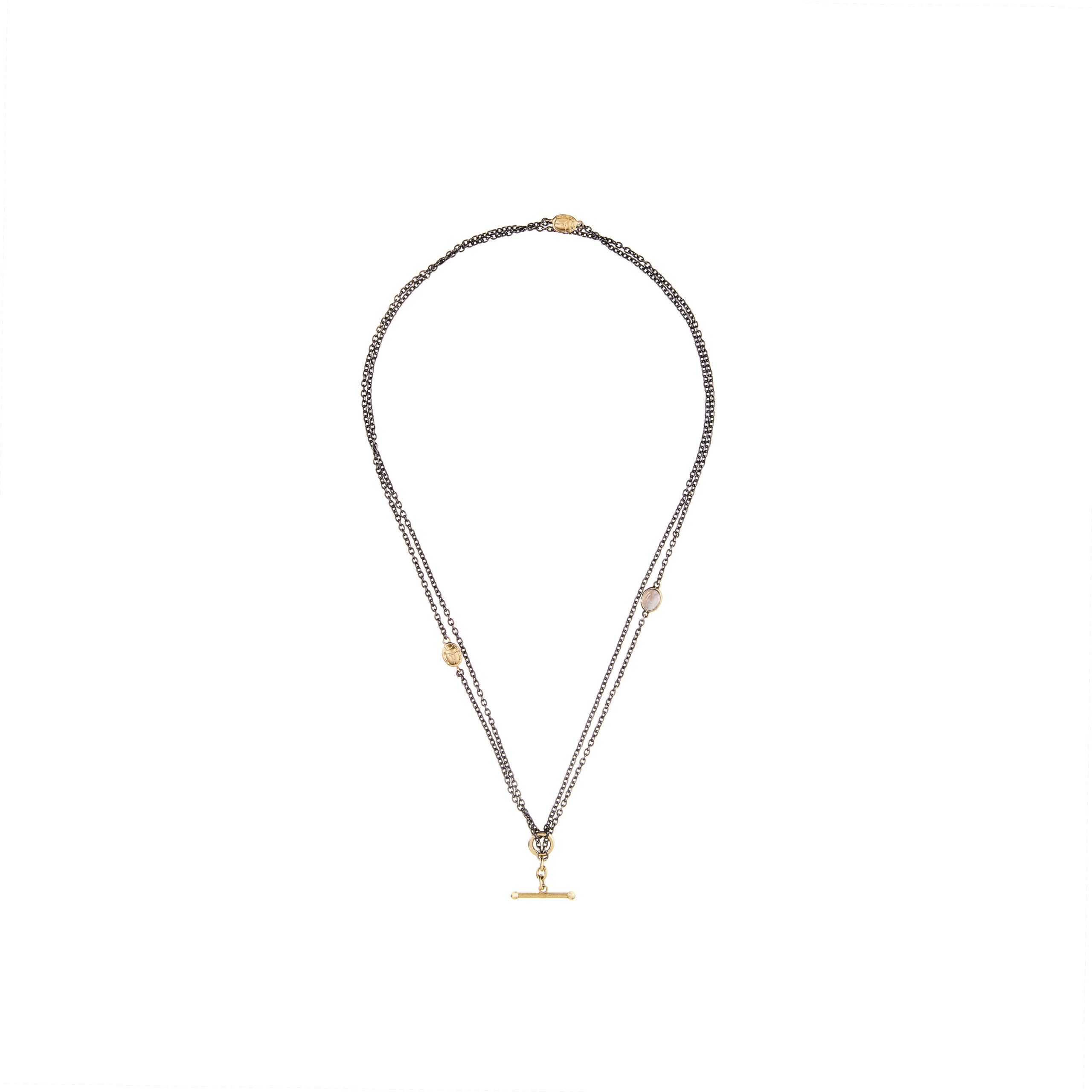 Double blackened silver and gold chain with rainbow moonstone and scarab charmsDouble blackened silver and gold chain with rainbow moonstone and scarab charms