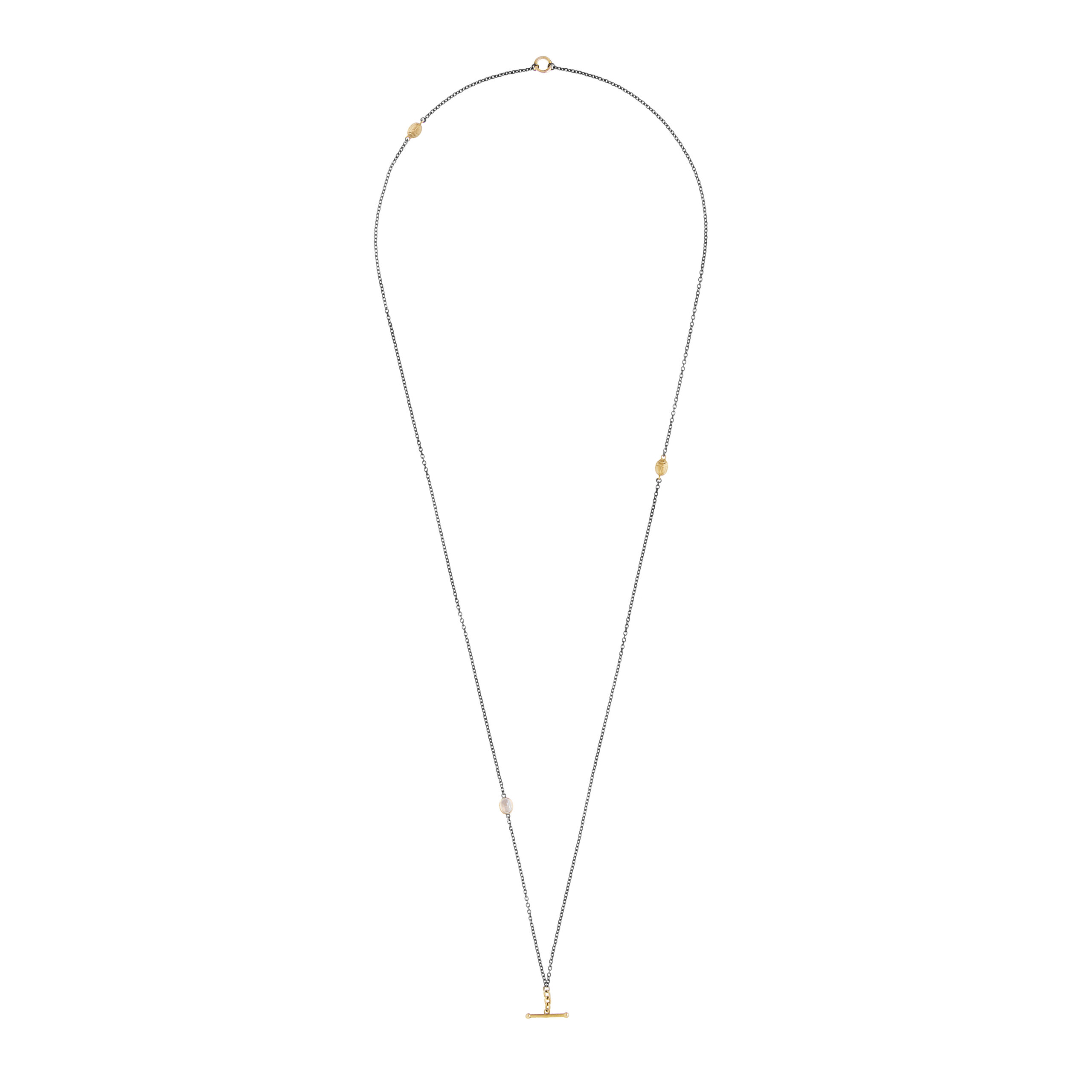 90cm long double blackened silver chain with two chubby yellow gold scarab charms and one 7x5mm oval cabochon rainbow moonstone set in 9ct yellow gold  secret scarab setting.  Chain can be doubled up using  gold T-bar and O-link and pendants can be hung onto this chain. This piece can also be made in rose gold instead of yellow gold.