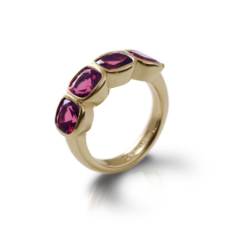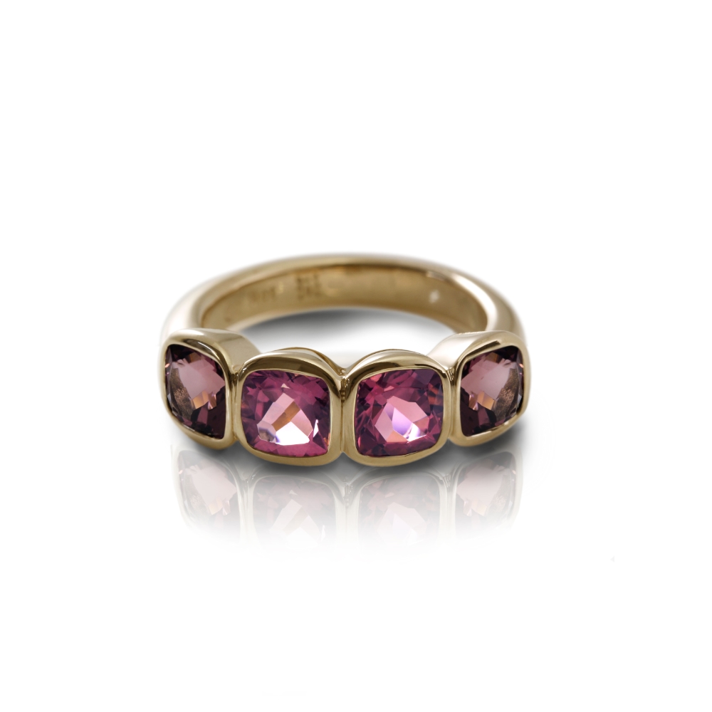 Four Stone Pink Rhodolite Garnet Gold Ring – polished solid yellow gold ring with four beautiful Cushion Cut Pink Rhodolite Stones (6mm each) in an integrated setting. Also available in Yellow Gold set with Citrine and Peridot. Also available in Silver with Peridot, Silver with Citrine, Silver with Amethyst and Silver with Blue Topaz. See our range of Gemstone Rings for sale online.