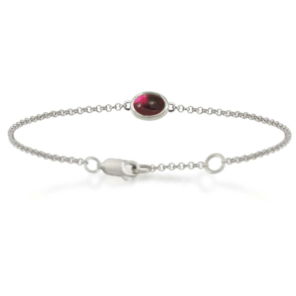 This lovely dainty Garnet Cabochon Bracelet makes the perfect January Birthstone gift. We set the best oval Garnet in our signature Scarab Silver setting (the flip side reveals the stylized scarab design we have become known for). The fine belcher chain and clasp can adjust from 17,5cm to 18,5cm (7 inches to 7.3 inches). Also available in Moonstone, Peridot and Swiss Blue Topaz. The same design available in two-tone blackened silver and red gold with Pink Tourmaline. See our range of Fine Bracelets.