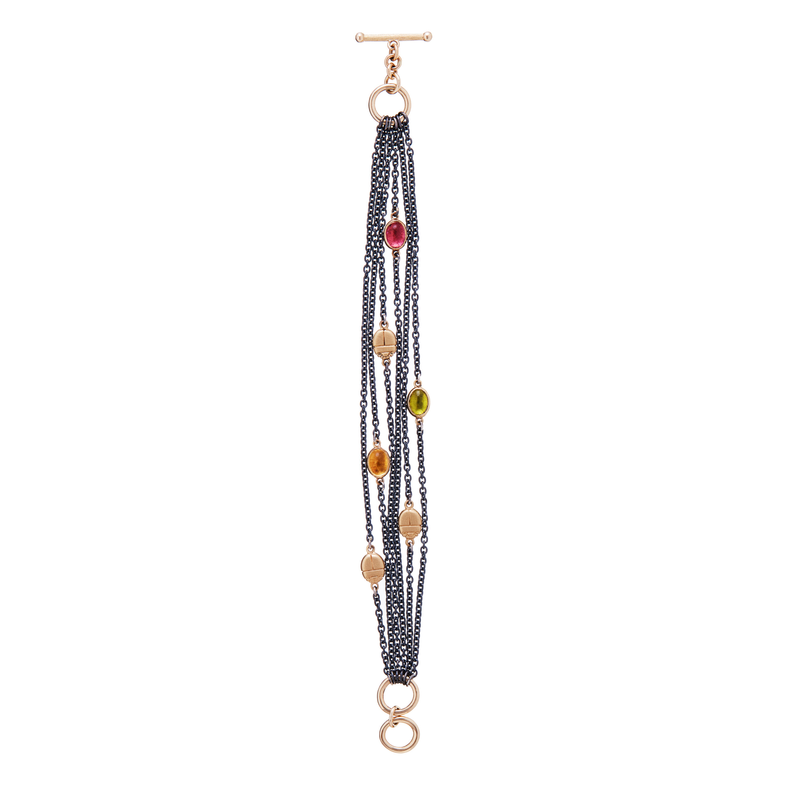 6 Strand blackened silver and 9ct yellow gold bracelet with three chunky gold scarabs and 7x5mm cabochon citrine, peridot and garnet set in secret scarab settings. This bracelet has a beautiful T-bar and O-link clasp which adds an extra touch of elegance.
