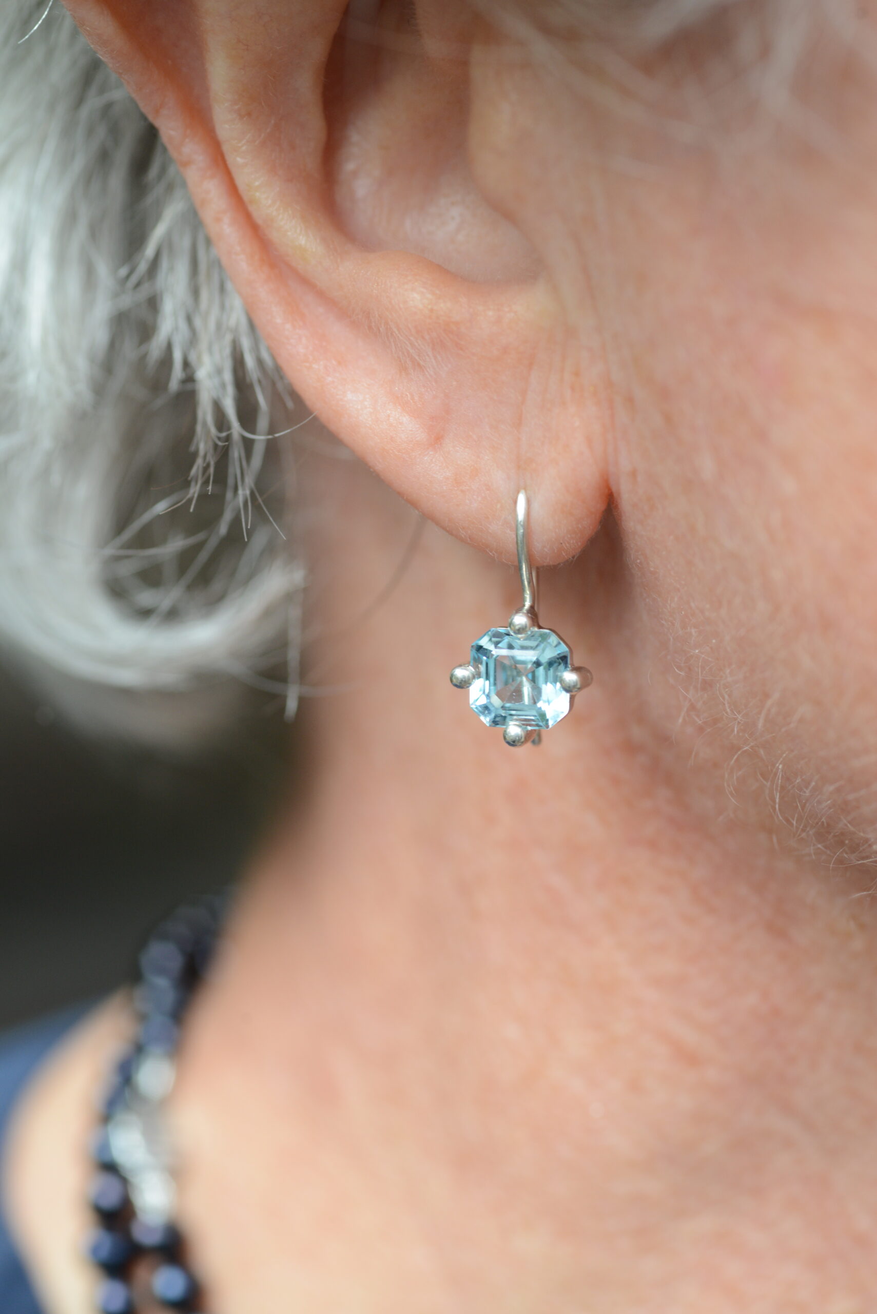 7mm Asher cut (square emerald cut) sky blue topaz set in four claws with hook and safety catch