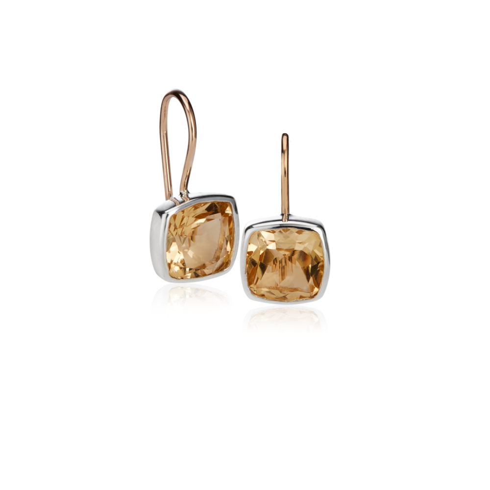 Silver Gold Citrine Boxy Earrings with classic square setting in solid silver polished to a high sheen shown here with a 8mm cushion cut citrine. Shepherd’s hook wire in 9 carat red gold for strength. Designed to make the most of the gemstone. Splendid design that transitions from day to night. Also available in Garnet and Amethyst.